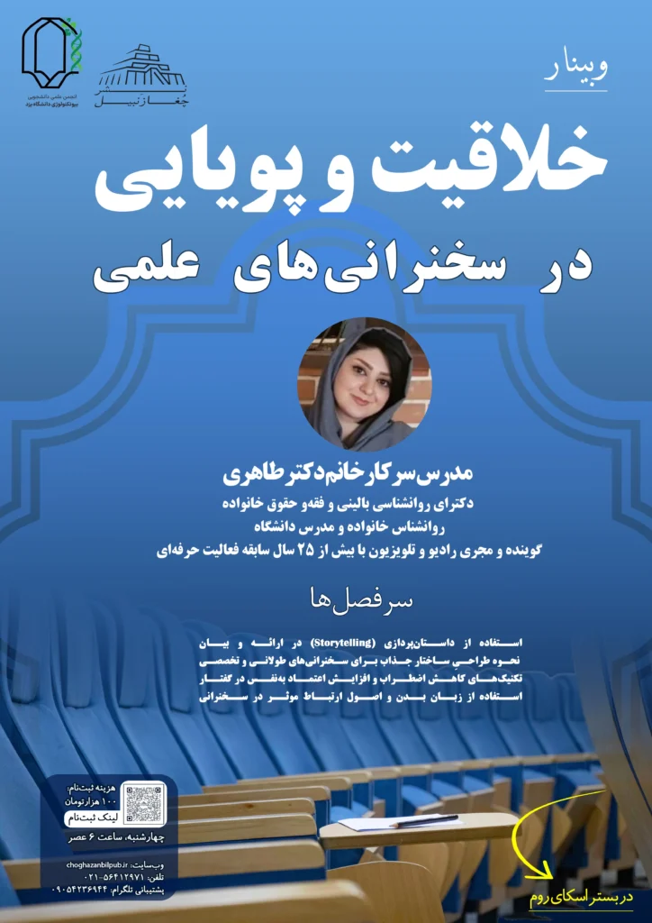 وبینار «خلاقیت و پویایی در سخنرانیهای علمی» با همکاری انتشارات چغازنبیل و انجمن بیوتکنولوژی دانشگاه یزد برگزار میشود